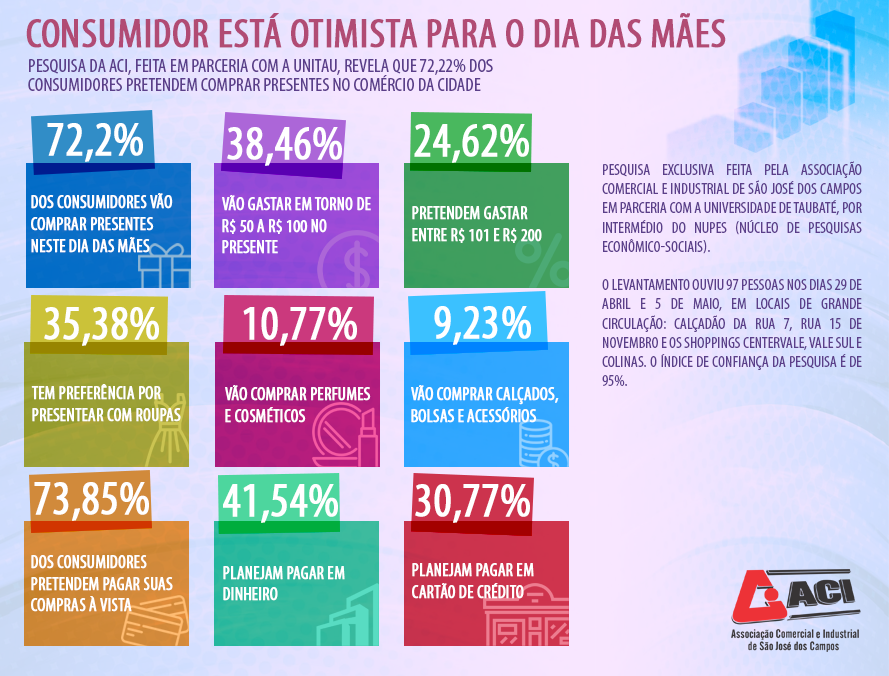 Segundo o levantamento da ACI/Unitau, 72,2% dos consumidores planejam comprar presentes neste Dia das Mães, um índice semelhante, dentro da margem de erro, ao registrado em 2019 (77,5%) e superior ao de 2018 (66%). Não houve pesquisa em 2020: em razão da pandemia do novo coronavírus, na ocasião o comércio estava com as portas fechadas e as vendas para o Dia das Mães foram realizadas on-line.
