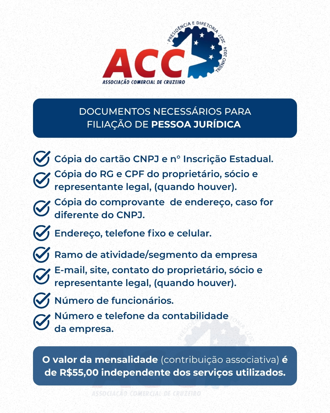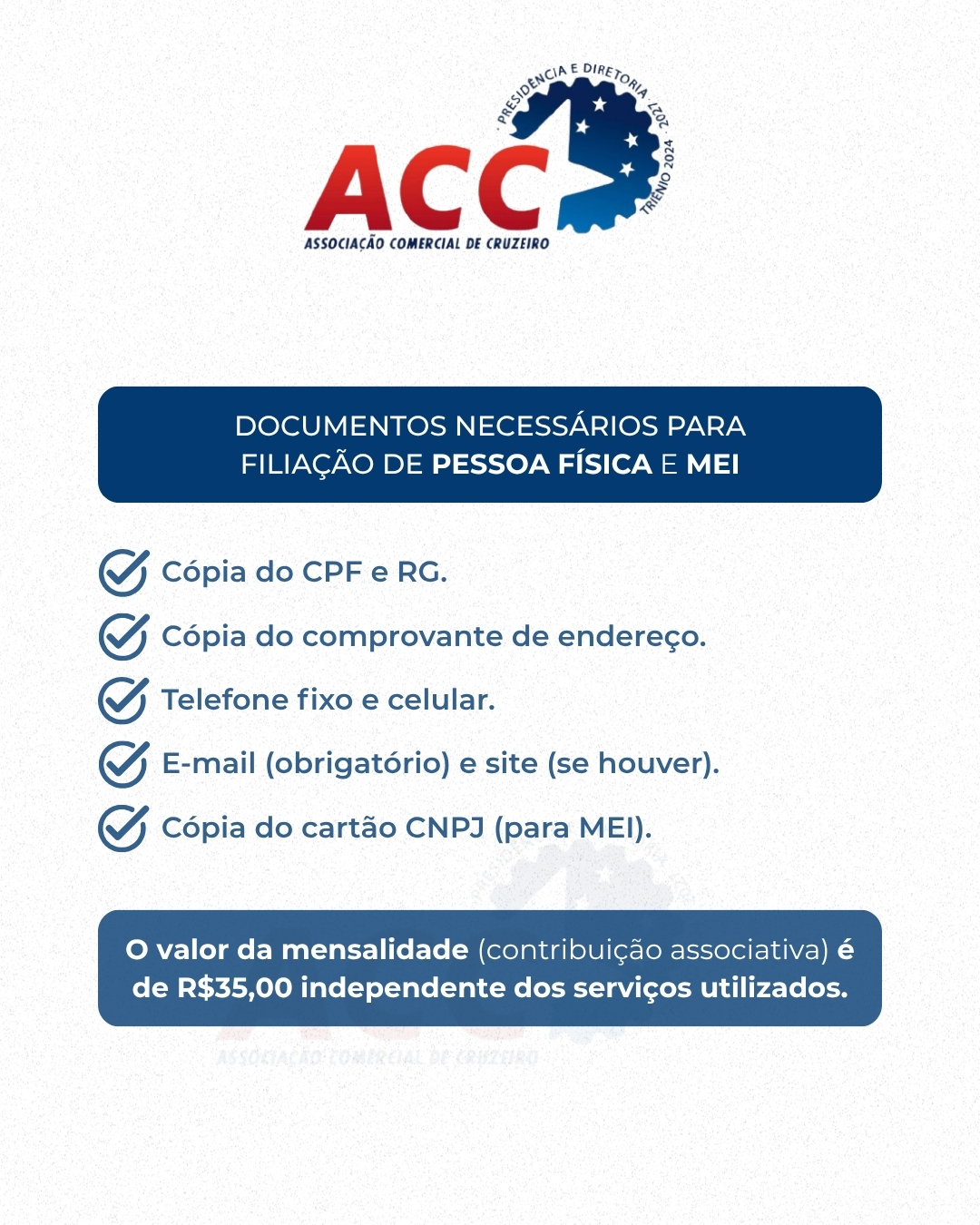 Nesta listinha, mostramos quais documentos você precisa para fazer parte da Associação Comercial de Cruzeiro e aproveitar todos os benefícios de ser um associado. 🤝✨