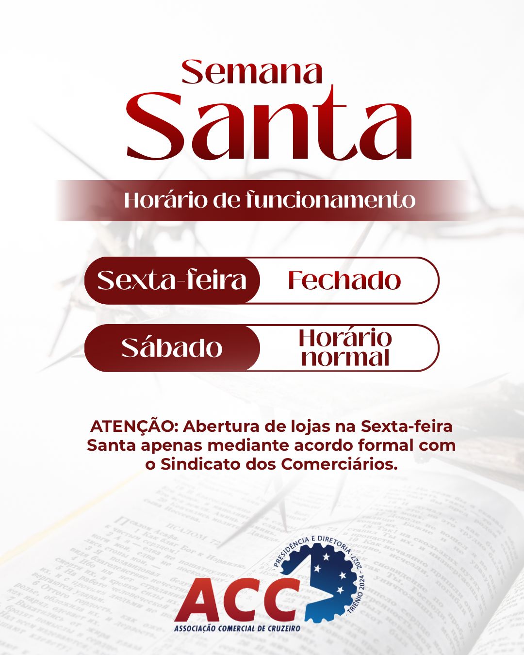 Informamos que, devido à Semana Santa, o comércio seguirá o seguinte horário: